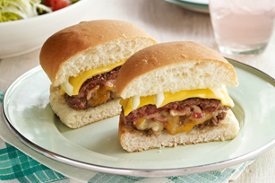 CRUMBLE bacon; mix with cooked onions and cheese. Shape meat into 8 thin patties. Top 4 patties with bacon mixture; cover with remaining patties. Pinch edges together to seal.